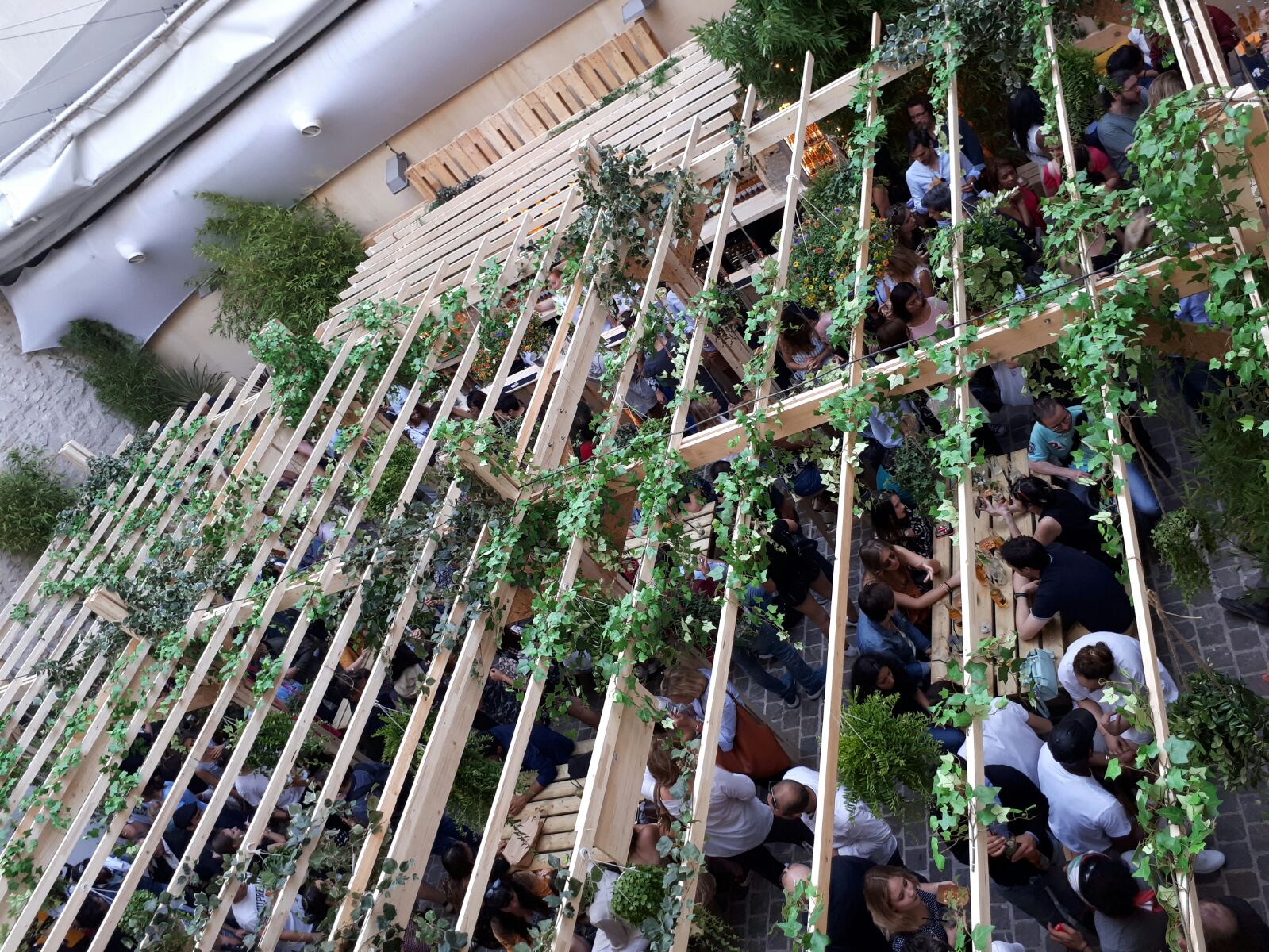Et c’est clairement l’heure des apéros en extérieur ! La déco est assez simple, réalisée à base de palettes de bois réarrangées en bars. Le tout apprêté de pots de fleurs très colorées. La terrasse ravira les fumeurs, qui viendront peupler l’espace sous la grande tonnelle en bois.