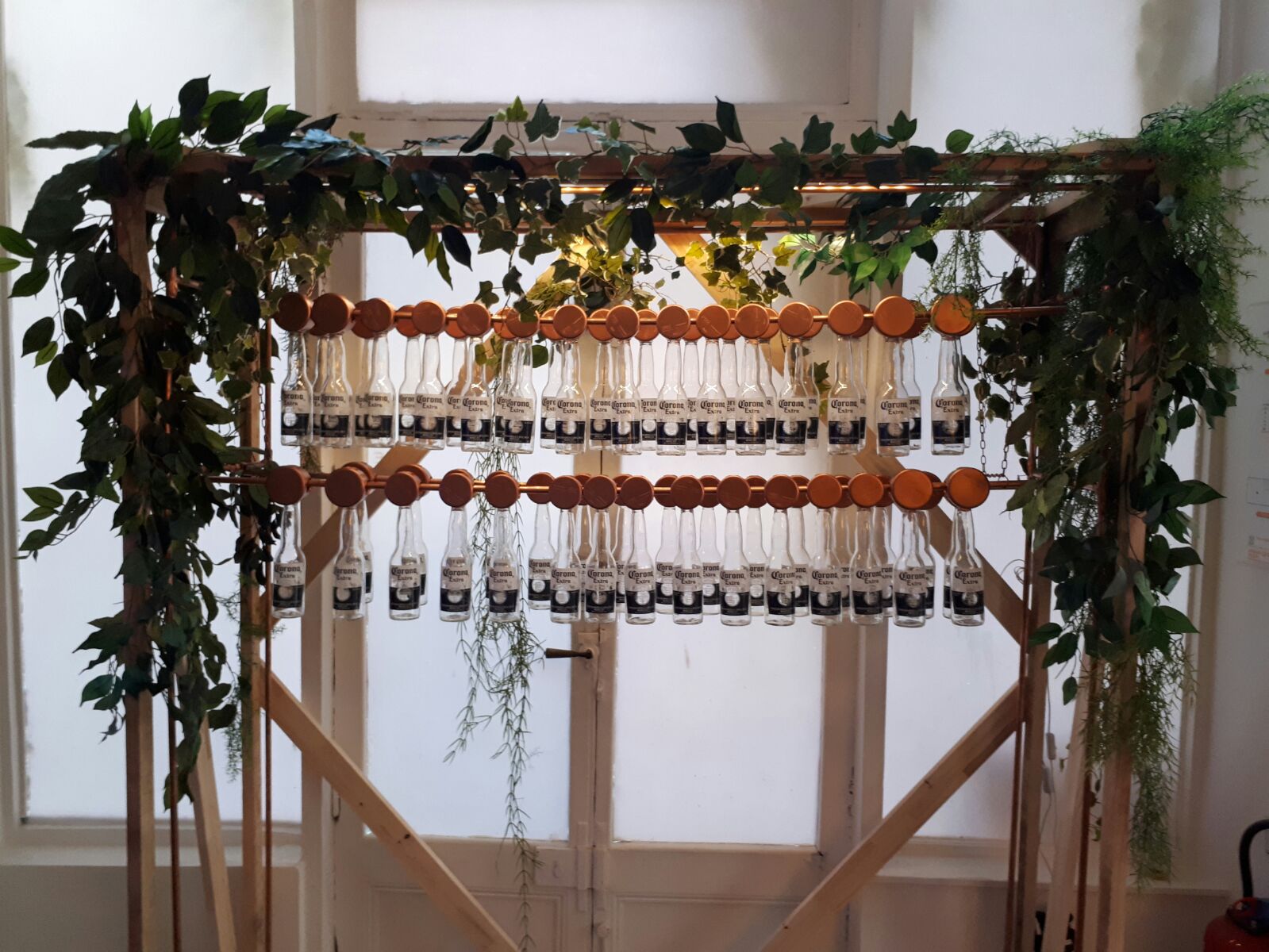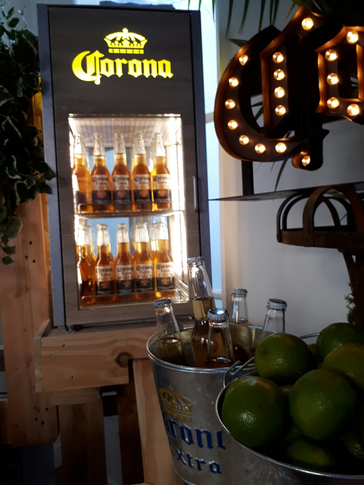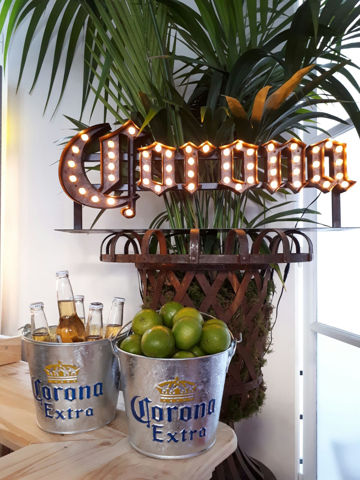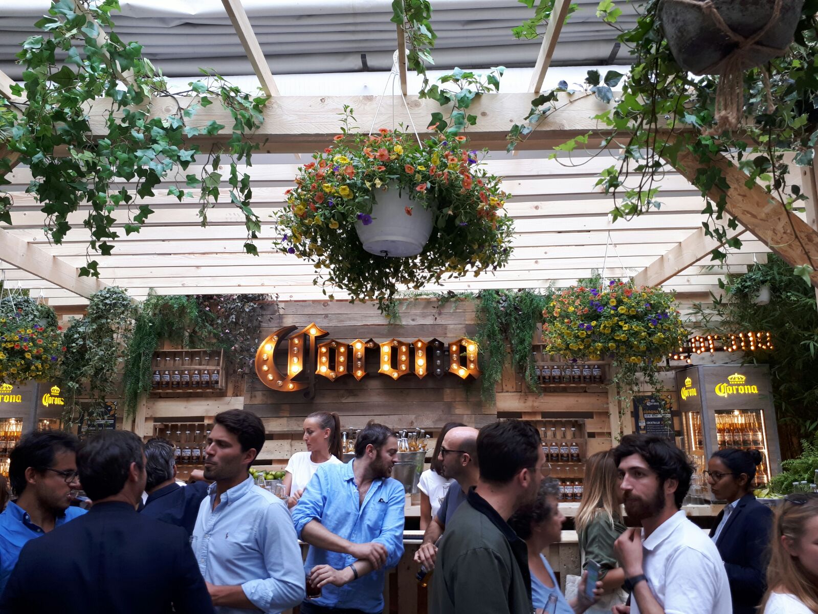 Le bar éphémère est décomposé en trois espaces : la terrasse extérieure agrémentée de deux bars, l’étage-appartement plus cosy qui accueille des artistes, et le sous-sol dansant dédié à la musique. Aux bars, on retrouve évidemment de la Corona mais aussi des cocktails.