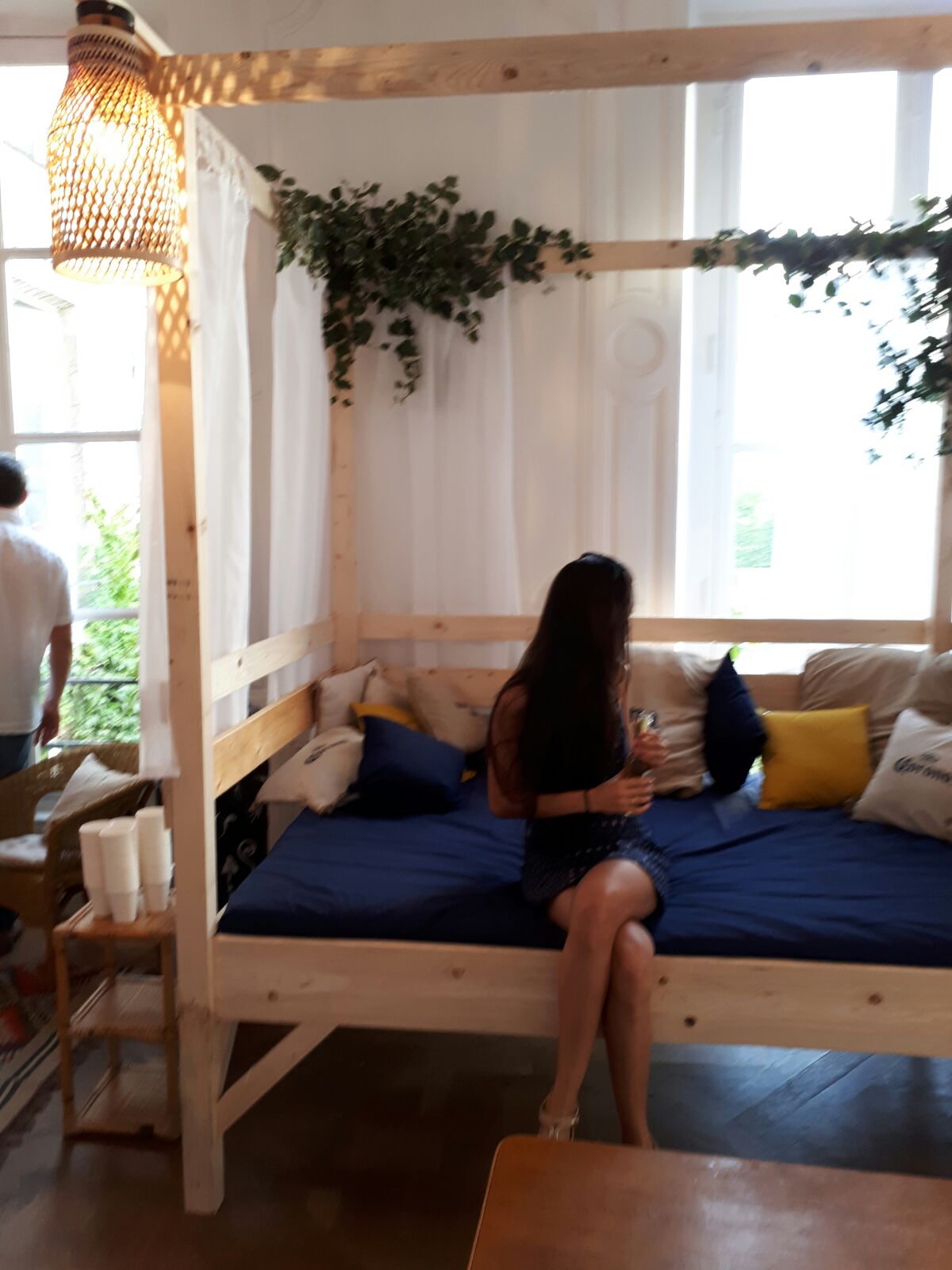 A l’étage, un super coin cosy est aménagé de grands lits et de chaises balançoires. C’est le lieu d’exposition des œuvres du peintre mexicain NEUZZ, qui nous a réalisé une fresque murale en live le 04 juillet, sous les yeux des invité. Belle performance !
