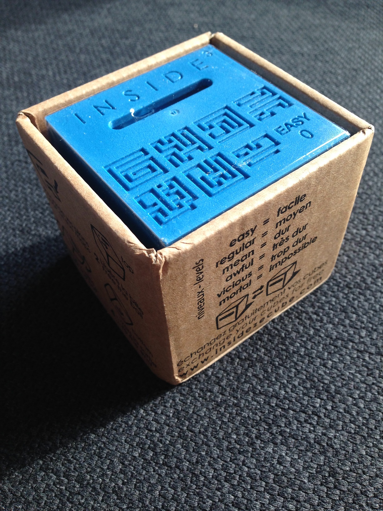 Pour le niveau le plus simple du cube, le plus facile, à savoir le Easy0 présenté ici, il m’aura fallu 10 bonnes minutes de concentration et un démontage car j’étais perdu. Mais quelle satisfaction que d’arriver au bout… Pour recommencer dans l’autre sens pour 3-4 minutes cette fois-ci. Je l’ai dit : il est possible de démonter le cube. C’est très pratique car permet de retrouver la localisation de la bille et de recommencer. Cela ouvre aussi la possibilité de créer ses propres niveaux en mélangeant les étages… Et de faire une petite blague à un pote qui dira maîtriser le sujet ! Ni vu ni connu, vous changer l’ordre des plateaux et le schéma sur le cube ne rime plus à rien !