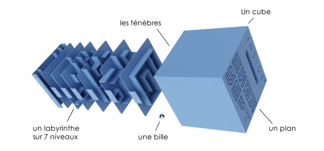 Mais alors, qu’est-ce ? Insidezecube propose une alternative très originale : énormément le cerveau, beaucoup la dextérité et déjà un peu moins les yeux. En effet, il s’agit d’un labyrinthe mais sans que vous puissiez en voir toutes les subtilités ! La petite boîte renferme plusieurs étages de labyrinthe en 3D totalement obscures et qu’il vous faudra traverser à l’aveugle sur la seule base de plans de niveau… en 2D !!! Alors autant je suis masochiste sur ce genre de jouets, autant les créateurs sont complètement sadiques !
