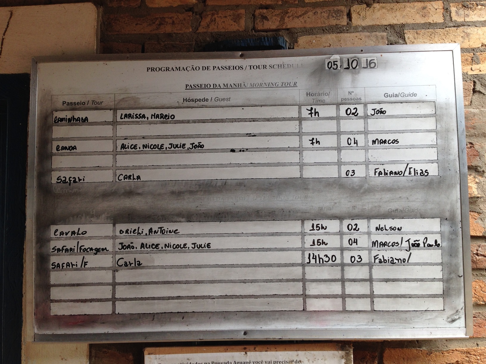Une fois sur place, la Pousada Aguapé se charge de tout : les différentes activités sont au départ de la ferme/hôtel. La voiture peut donc dormir sous un arbre quelques jours. L’auberge est très vaste, avec une première grande maison de plein pied constituant l’accueil et des parties communes de détente. Les logements sont derrière, dans d’autres bâtiments d’un seul niveau. Notre chambre était spacieuse et confortable, et la salle de bain très fonctionnelle. N’oubliez pas que, en plein milieu de la nature, ces équipements sont déjà excellents ! Pour les repas, rendez-vous dans la troisième partie de la pousada : une grande pièce couverte d’un toit, côtoyant la piscine d’un côté, et de l’autre les animaux sauvages qui osent s’y aventurer !