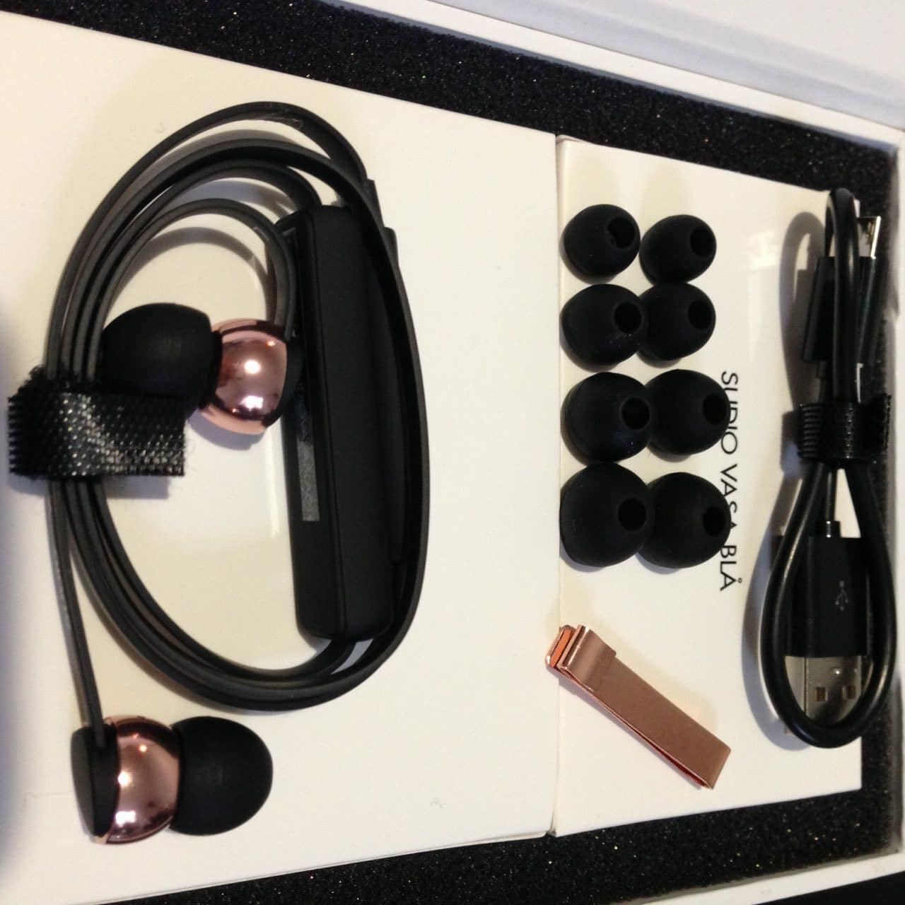 Première étape : déballage ! Et premier constat sans appel : on ne peut pas faire plus sobre. La marque joue à fond sur les contrastes, avec une dominante blanche. La présentation du produit rappelle étrangement ce que propose aussi Appel dans son domaine. Peut-être cela nous donne-t-il aussi une indication de la cible marketing de Sudio ? C’est en tout cas réussi, donne une impression de rigueur (cohérent avec l’image que renvoient les pays Scandinaves) et est très élégant. Le modèle de test est le Sudio VASA Blå Or Rose Noir.