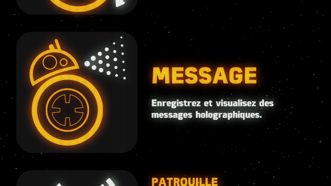 Car si aujourd’hui il peut bouger la tête (il dit oui, non, peut prendre peur ou être énervé) et changer de couleur (il se fâche tout rouge quand il se prends un mur), de nombreuses évolutions devraient arriver au travers de l’application. BB-8 va donc se forger une pseudo personnalité en vous accompagnant au quotidien avec vous. Dans les mises à jour que l’on souhaiterait voir à l’avenir, l’ajout de nouveaux messages en hologramme (en fait en réalité augmentée) serait un vrai plus, ceux chargés par défaut étant un peu limités. La réaction aux commandes vocales devrait aussi s’améliorer un peu afin d’être tout à fait au point. Mais avec des mises à jour rapide à effectuer (en positionnant le téléphone à proximité de BB-8 pour le démarrer), nul doute que cela se fera rapidement.