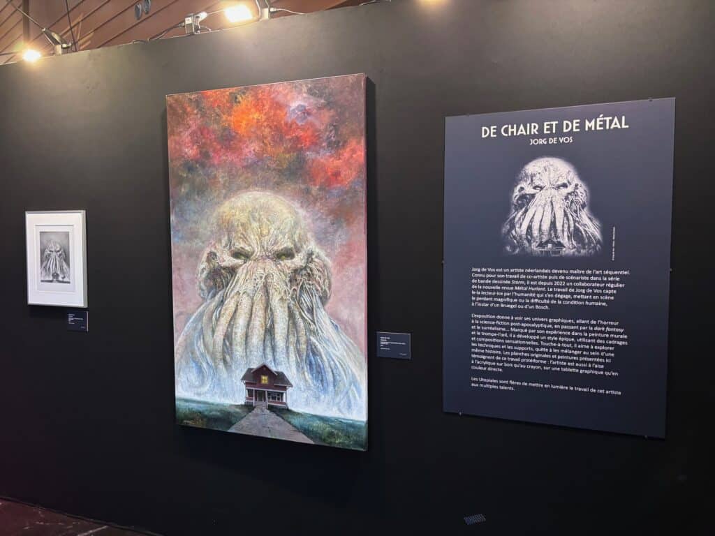 Bien d’autres expositions sont proposées, permettant de découvrir des artistes et leurs univers. On peut par exemple citer «De chair et de métal» qui revient sur le travail de Jorg de Vos. Véritable artiste multi-facettes, il nous présente ici son lot de peintures, sculptures et autres planches de BD qui nous plongent dans un univers sale, graphique ou tout semble organique. A la manière de H.R Giger, son univers dérange autant qu’il fascine. Il est à noter que Jorg de Vos nous a gratifié d’une magnifique fresque qu’il a peint sur deux jours lors du festival. Une véritable chance de pouvoir voir l’artiste en action. On peut aussi citer «Ultimate Bagarre» de l’École Pivaut, qui présente le travail de ses étudiant dans la réalisation de couverture de comics, en hommage à Stéphanie Hans. Il est très intéressant de voir ces œuvres toutes très différentes dans le fond et la forme de l’illustration.